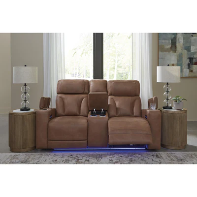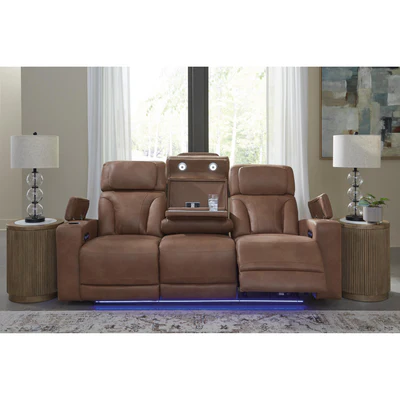 Ready to relax in style? Our luxurious power reclining sofa doesn't just look fantastic—it also delivers creature comforts and fabulous functionality. Adjustable headrests ensure a perfect TV view no matter how far back you recline. Faux leather upholstery, a drop-down table with reading lights and ambient LED lighting go beyond your typical theater-style experience. Movie nights and chill time just got a whole lot sweeter.